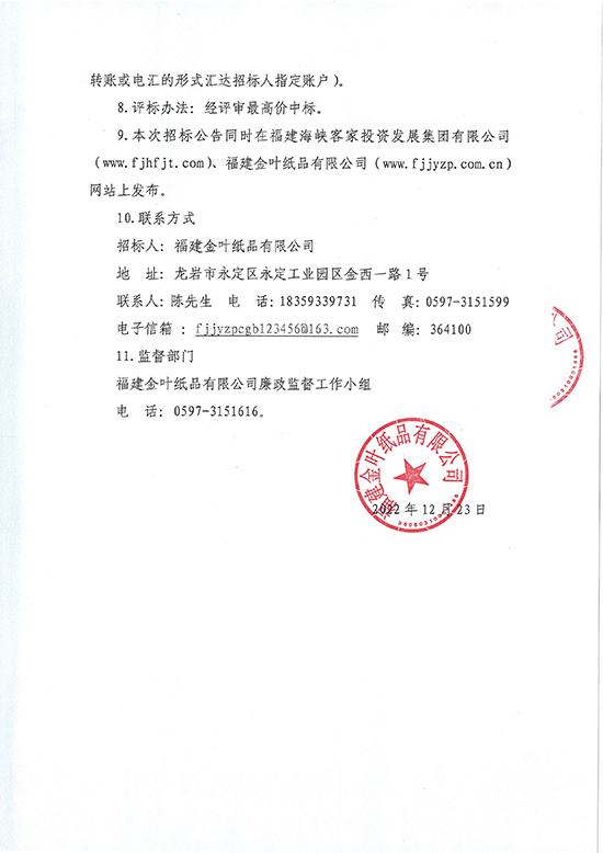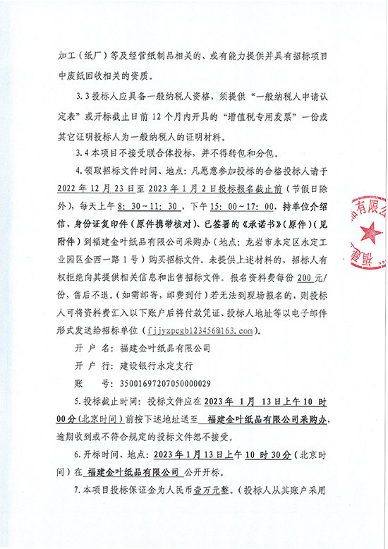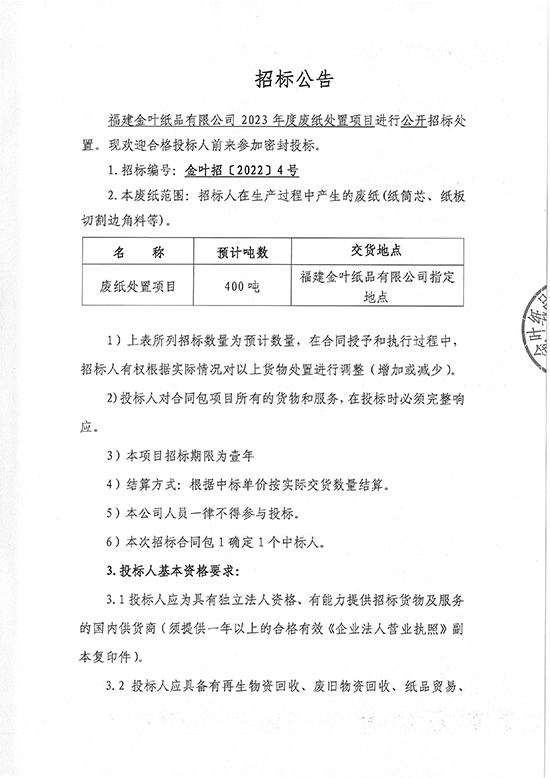福建金葉紙品有限公司2023年度廢紙處置項目招標公告